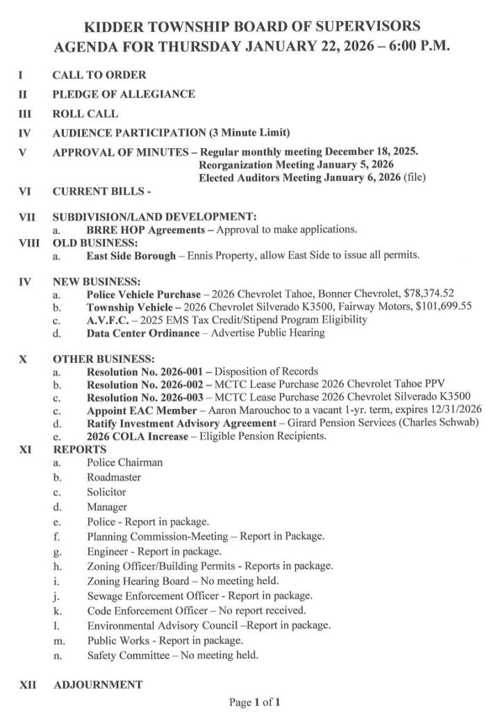 The next Kidder Township Board of Supervisors Meeting will be held Thursday January 22, 2026 at 6:00 p.m.