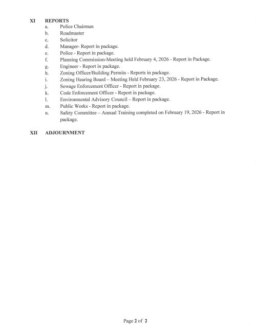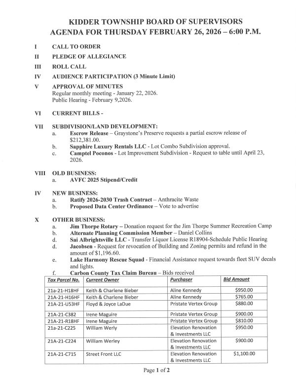 The next Kidder Township Board of Supervisors Meeting will be held Thursday February 26, 2026 at 6:00 p.m.